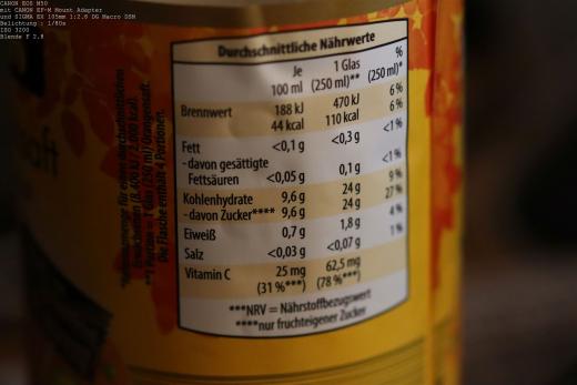 Hier tritt der Cropfaktor x 1,6 ein. Dadurch effektive Brennweite 168mm. Das Objekt "rückt" näher ran. Gleichzeitig bei Blende 2.8 etwas längere Belichtungszeit, aber immer noch kürzer als bei der 5D Mark II, was vermutlich aber am lichtempfindlicheren Sensor der M50 liegen mag.