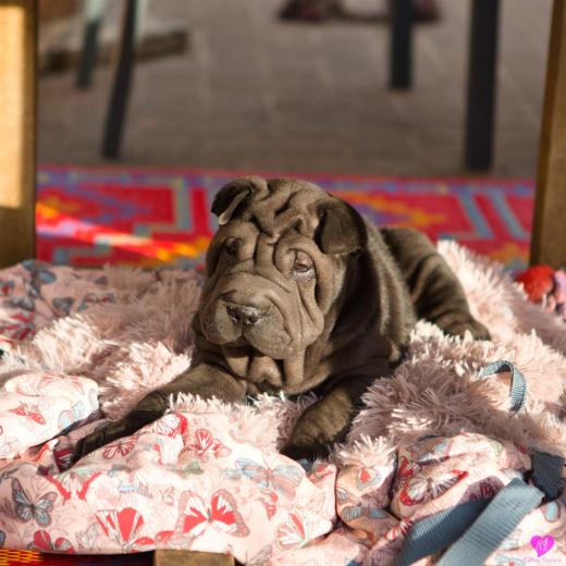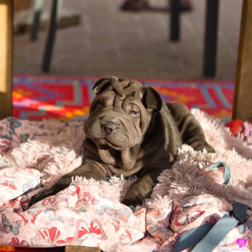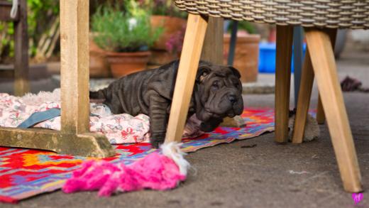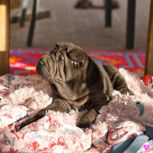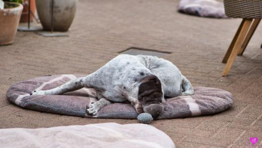 Unter dem Tisch auf seiner Kuscheldecke. Das liebt er.