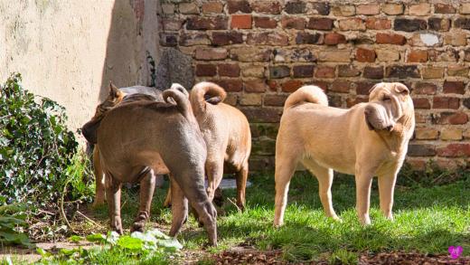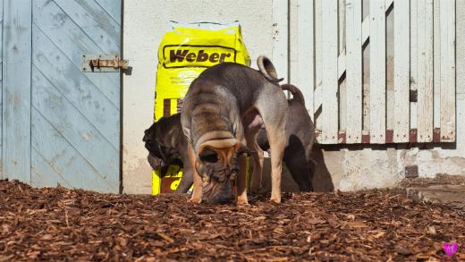 Nachdem die einwöchigen Bauarbeiten mit Bagger - Anschluss der Scheune, Kanalisation, Wasser, Heizung, Strom - abgeschlossen sind, was die Rotte mit großartiger Gelassenheit über sich ergehen lassen hat, mussten sie das "neue" Gelände, erst mal wieder erkunden. Und unsere Mauer ist auch weg, die bisher den Garten vom Hof abgetrennt hatte. Die Hunde und wir finden diesen jetzt vollkommen offenen Bereich ganz toll. Aber erst mal muss alles aufs gründlichste erschnüffelt werden :-)
