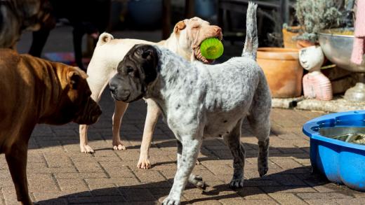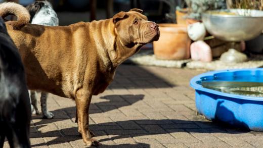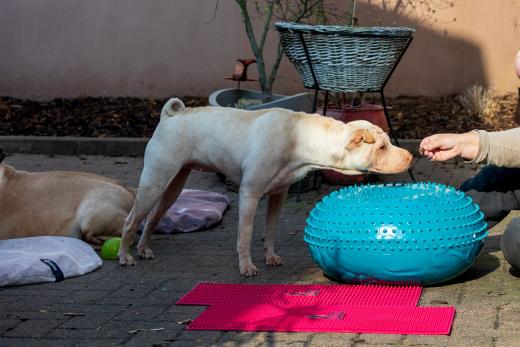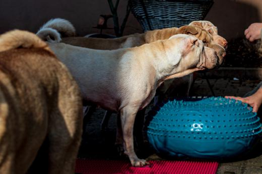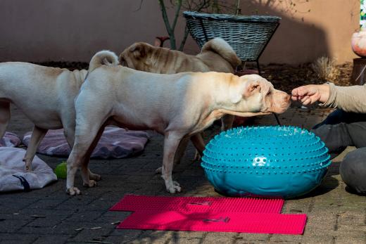 dem Rudel wird "erklärt", was das für tolle neue Dinge sind. Physio-Therapie für Holly.