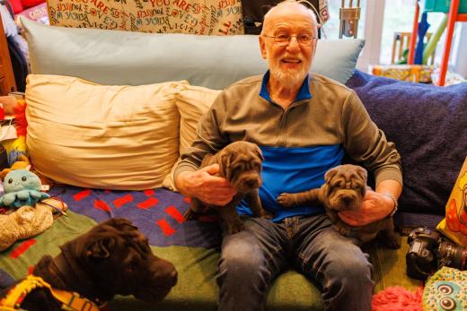 Nach der Wurf-Abnahme beim Arzt und Impfen und Chippen haben wir den Papa BRAN bei Kristina und Sean getroffen und der Opa, der immer gerne mal auf Caoimhe und Bran aufpasst, wollte es sich auch nicht nehmen lassen, die Kinder von Bran mal zu knuddeln. Die Kleinen fanden es ganz großartig und auch Bran und Caoimhe hatten einen riesen Spaß.