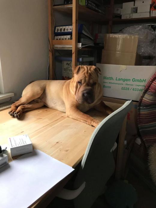 Mittlerweile haben wir den ehemals auf dem Schreibtisch stehenden Computer weg räumen müssen, da Monk der Meinung war, das Ding steht sowieso nur im Weg. Man kann es auch "liebevoll" beiseite schieben. Mal mehr, mal weniger liebevoll. Dem Hund, nein dem Computer zuliebe, haben wir nachgegeben und den Computer an einen sicheren, für Monk uninteressanten Platz gestellt.
