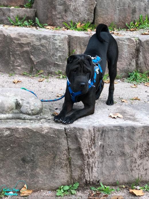 Shar Pei sind zwar nicht die klassischen Schweißhunde, aber immerhin hat unsereiner Vorfahren sich fleißig an der Wildschweinjagd und Co beteiligt, um die Familie zu ernähren. Sowas geht auch nur mit Nase und Köpfchen. Und deswegen darf ich jetzt einmal in der Woche Leckerli suchen gehen. Ok, Leute. Leute mit Leckerli. Ist doch fast dasselbe! Man trifft sich dazu entweder im Wald oder in der Stadt, einer geht sich verstecken, ich bekomme dann einen „Geruchsträger“ unter die Nase gehalten und auf Kommando geht’s ab die Post! Bislang hab ich die Spur immer bis zum Ende verfolgt. Manchmal sitzen da dann unbekannte Menschen hinter einem Busch, die komischerweise genauso riechen wie die Spur – die muss man natürlich erstmal anwuffzen. Aber Leckerli haben die erstaunlicherweise trotzdem dabei! Ich find’s jedenfalls super – und Frauchen freut sich über die langen Spaziergänge.