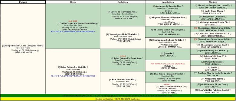 Der Stammbaum vom C-Wurf, exemplarisch für Olympe Maxime. Der Ahnenverlustkoeffizient (AVK) ist mit 96,77% wieder sehr gut. Er Inzuchtkoeffizient ist auch in diesem Fall 0 (Null), weil es keine gemeinsamen Ahnen bei den Eltern gibt. Deswegen ist immer eine Kombination von AVK und IK zu betrachten.