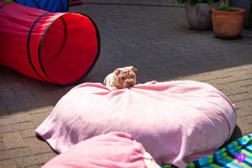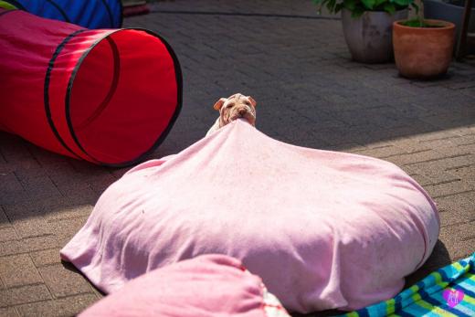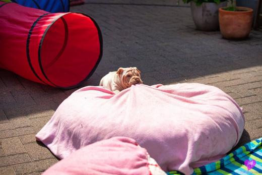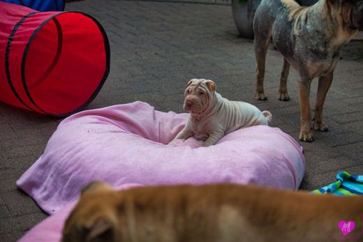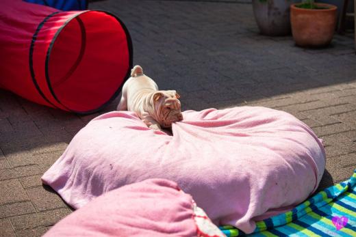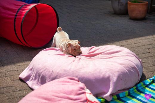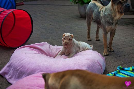 Ein süßes Horse Coat Mädchen. Creme Farbig, hat aber trotzdem das sie dilute ist, eine dunkel lila Zunge, durch die dunkle Farbgebung von Papa Cooper. Sie wird eine recht große kräftige Hündin die jetzt schon sehr bullig ist, auf schönen langen Beinen. Immer unterwegs, immer Balli spielen, eine sehr agile Hündin, immer vorne dabei.