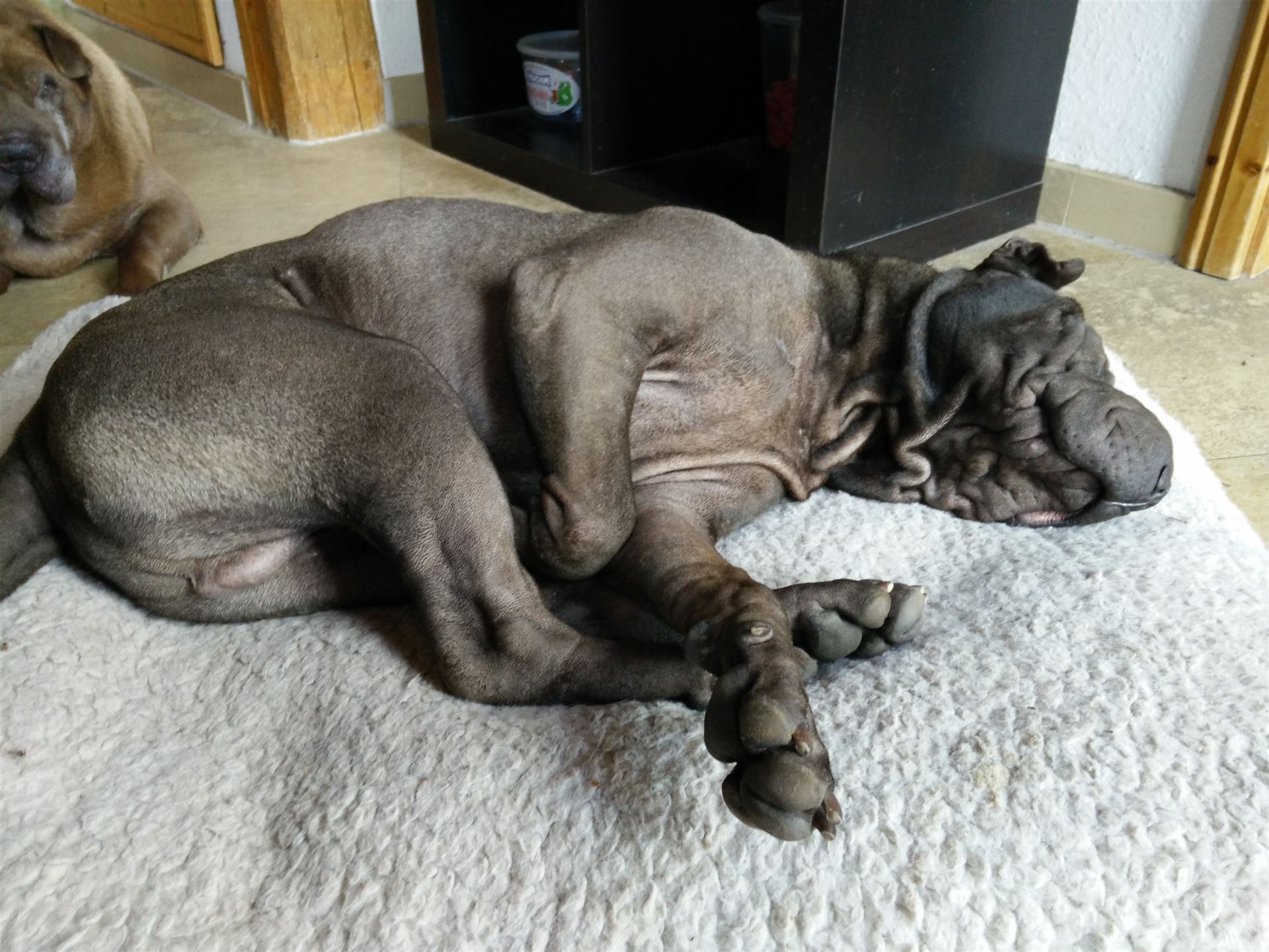 Auf der Suche nach Ergänzung zu unserem Rudel fanden wir über Facebook die Zucht "Shar Peis vom Sonnenberg" von Beatrix und Hannes Pachta. Damals hatte Wally eine schwere Bein-OP hinter sich und konnte nach der OP nicht mehr mit Pink Floyd spielen. Pink Floyd stand immer wieder "traurig" vor Wally und konnte nicht verstehen, warum sie nicht mit ihm spielen konnte. Kann ein Shar Pei Depressionen haben? Damals waren wir fest davon überzeugt. Pink Floyd ging es wirklich nicht gut. Und so suchten wir übers Internet einen Spielgefährten. Auf Facebook blieben wir immer wieder auf den zauberhaften Bildern des Wurfes von Beatrix und Hannes hängen. Besonders das "Nilpferdchen" Coolio-Cooper hatte es uns angetan. Da uns Beatrix vom lebhaften Charakter der Wurfmutter "Little Whirlwind" Charlet erzählte, passte das zu unserem Wunsch für Pink Floyd einen lebhaften Spielgefährten zu bekommen. Sie erzählte uns auch, das sie mehr in die ursprünglich traditionelle Richtung züchten würde, was gleichzeitig mehr Agilität bedeutet. Wir hatten aber keine Ahnung, wie groß der Unterschied wirklich ist. Coolio-Cooper ist der agilste Shar Pei den wir kennen. Er kann ohne Anlauf aus dem Stand auf einen Tisch springen. Wir sind davon überzeugt, dass er Windhund ähnliche Geschwindigkeiten erreichen kann. Aber verbunden mit einer unglaublichen Ausdauer. Ein unglaubliches Kraftpaket und trotzdem liebevoll zu seiner Familie und seinem Rudel. Pink Floyd und Coolio-Cooper waren vom ersten Augenblick an beste Freunde, wie man weiter unten im Video sehen kann. Und Pink Floyd ging es sofort wieder besser mit seinem neuen Spielgefährten.