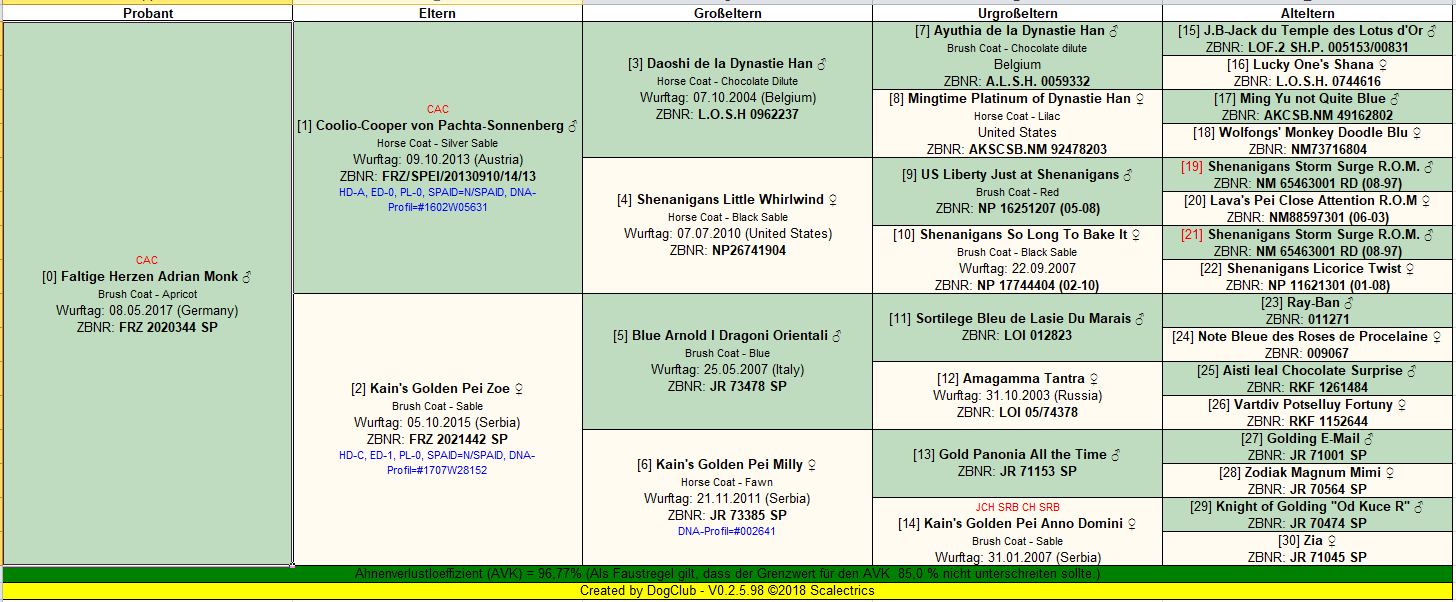Der Stammbaum vom A-Wurf. Der Ahnenverlustkoeffizient (AVK) ist mit 96,77% sehr gut. Er Inzuchtkoeffizient ist in diesem Fall 0 (Null), weil es keine gemeinsamen Ahnen bei den Eltern gibt. Deswegen ist immer eine Kombination von AVK und IK zu betrachten.