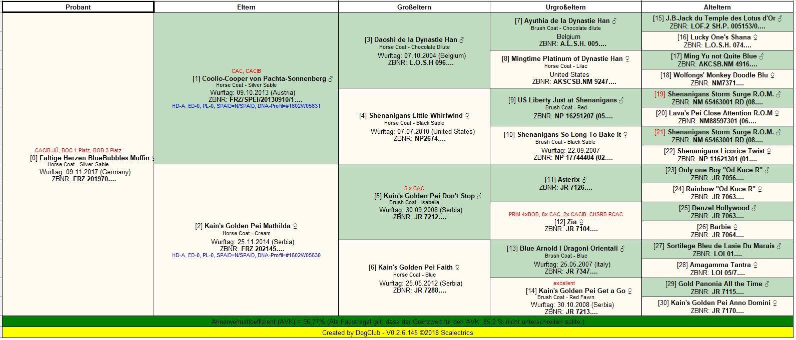 Der Stammbaum vom B-Wurf. Der Ahnenverlustkoeffizient (AVK) ist mit 96,77% wieder sehr gut. Er Inzuchtkoeffizient ist auch in diesem Fall 0 (Null), weil es keine gemeinsamen Ahnen bei den Eltern gibt. Deswegen ist immer eine Kombination von AVK und IK zu betrachten.