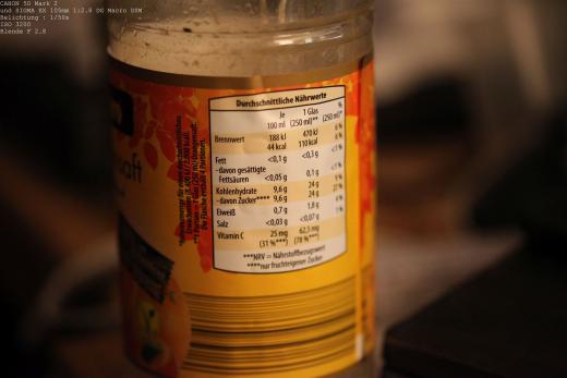 Hier tritt der Cropfaktor x 1,6 ein. Dadurch effektive Brennweite 168mm. Das Objekt "rückt" näher ran. Gleichzeitig bei Blende 2.8 etwas längere Belichtungszeit, aber immer noch kürzer als bei der 5D Mark II, was vermutlich aber am lichtempfindlicheren Sensor der M50 liegen mag.