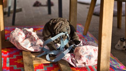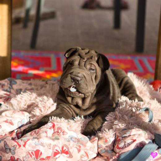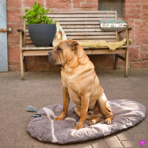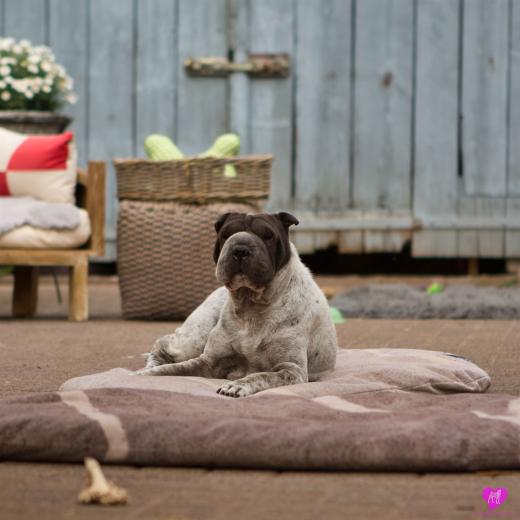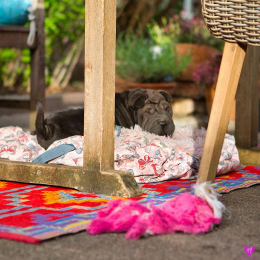 Unter dem Tisch auf seiner Kuscheldecke. Das liebt er.