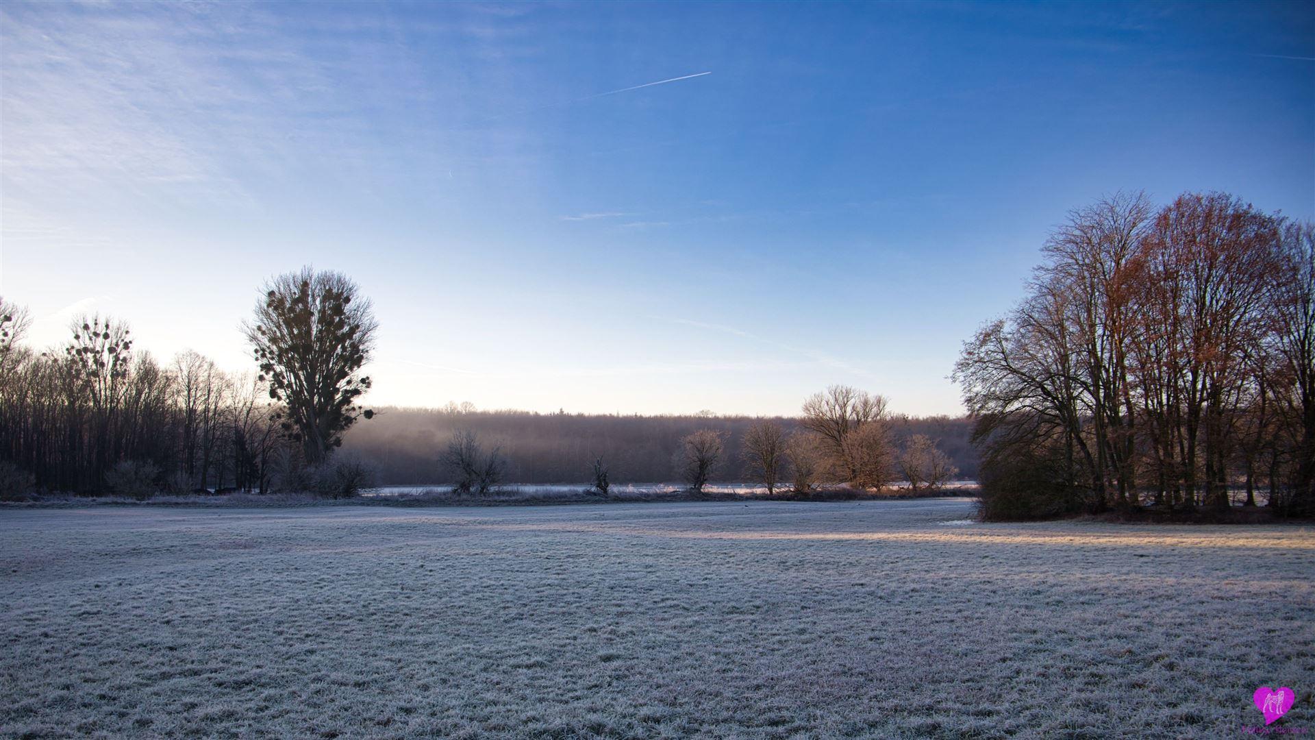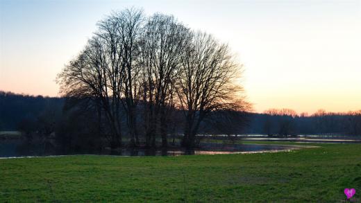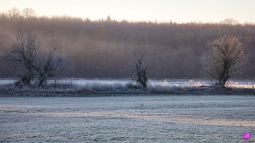Früh Morgens vor der Arbeit an unseren Auwiesen mit Tau auf den Wiesen.