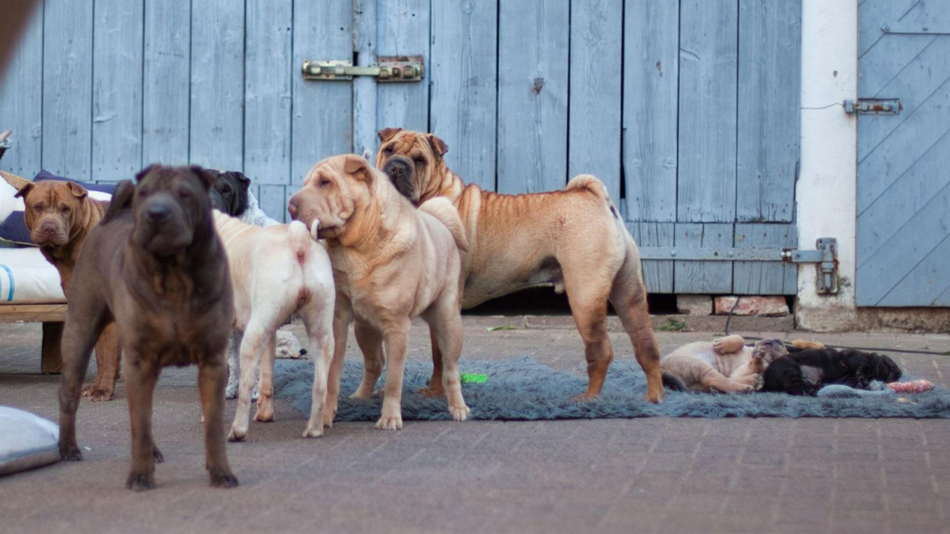 Sechs auf einen Streich und die Welpen. Tilly ist läufig und drinnen bei Andrea und Neelix bewacht Tilly.