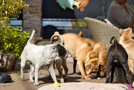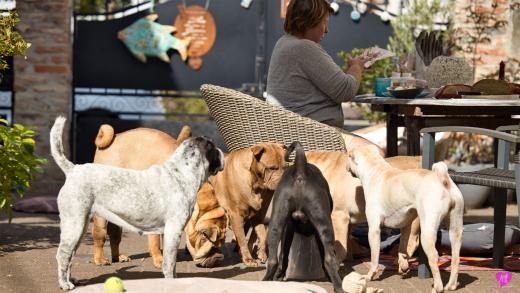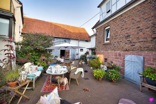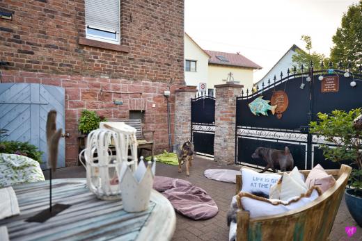 Weitwinkel Aufnahme fast des ganzen Hofs. Hinterm Haus ist noch ein Garten zum Toben für die Hunde.