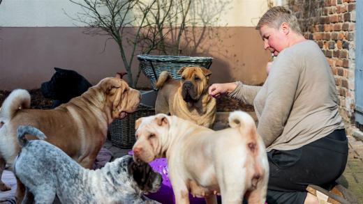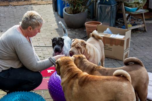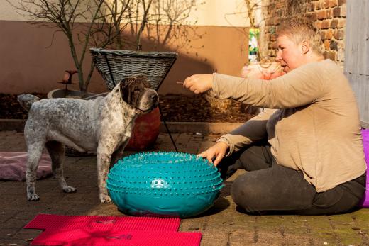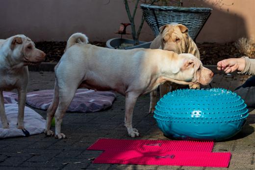 dem Rudel wird "erklärt", was das für tolle neue Dinge sind. Physio-Therapie für Holly.