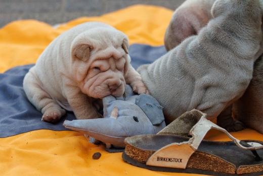 Nein *keine* Werbung für Birkenstock, aber der H-Wurf hatte sichtlich Spass mit dem fast ausgedienten Schuhen von Andrea :-) Und JA, Andrea trägt diese Schuhe immer noch. Ein toller Nachmittag auf dem Hof mit unserem H-Wurf, der sich ganz großartig Entwickelt. Alles kleine Charakterköpfe, die sich prächtig entwickeln.