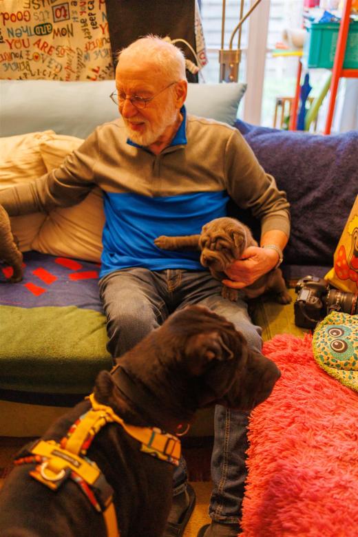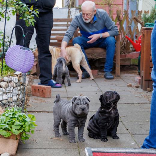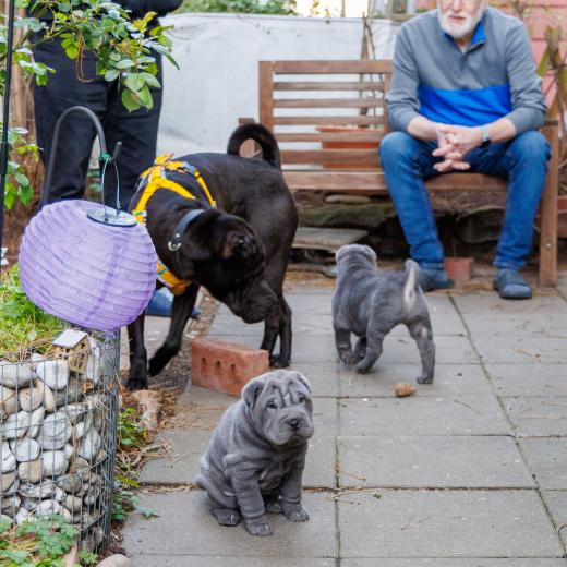 Nach der Wurf-Abnahme beim Arzt und Impfen und Chippen haben wir den Papa BRAN bei Kristina und Sean getroffen und der Opa, der immer gerne mal auf Caoimhe und Bran aufpasst, wollte es sich auch nicht nehmen lassen, die Kinder von Bran mal zu knuddeln. Die Kleinen fanden es ganz großartig und auch Bran und Caoimhe hatten einen riesen Spaß.