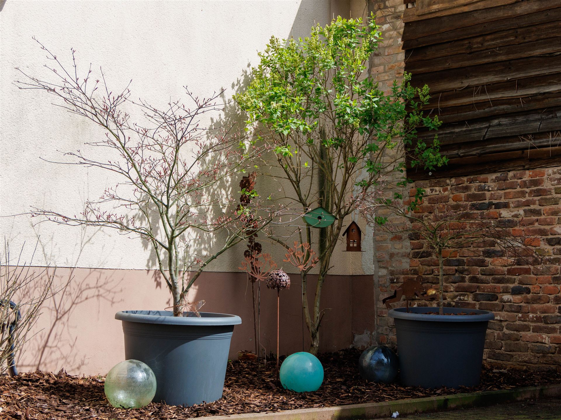 Wir haben die Bäume in 180L Töpfe umgetopft. Jetzt können die wachsen.
