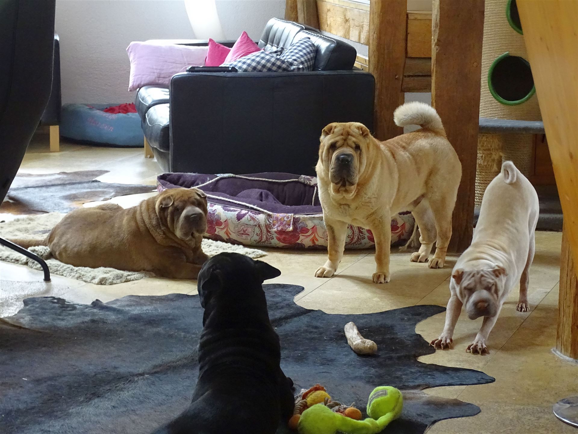 Lucy haben wir aus der Zucht von von Sabina Schumann, die in Österreich ein Gestüt mit Ferienwohnungen und eine Shar Pei Zucht betreibt. Sie war für ihr Alter unglaublich gut sozialisiert und hatte vor überhaupt nichts Angst oder fühlte sich trotz des Umzuges sofort bei uns wohl. Überhaupt ist sie die kommende Rudelchefin. Sie ist eine sehr selbstbewusste Hündin, die sehr in sich ruht. Sie ist eine tolle Hündin mit viel Potential für die Zucht zumal ihre Eltern eine sehr gute Gesundheit vorweisen können und frei von Shar Pei Fieber sind. Bei einer kommenden Zuchtprüfung von Lucy wird sich noch herausstellen, ob Lucy eventuell N/N sein wird, die Wahrscheinlichkeit ist mit 75% dafür sehr hoch.