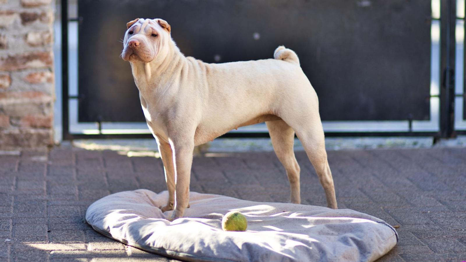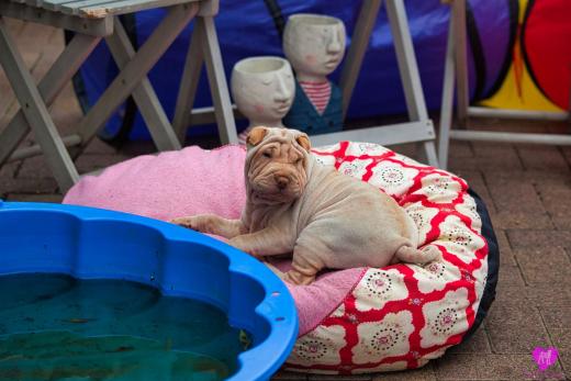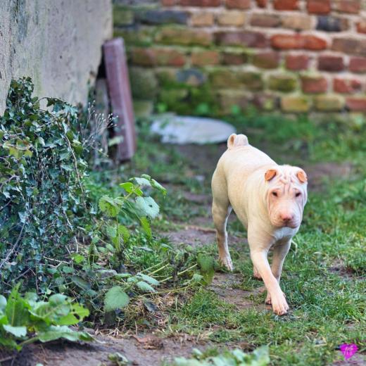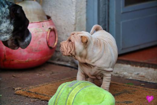 Ein süßes Horse Coat Mädchen. Creme Farbig, hat aber trotzdem das sie dilute ist, eine dunkel lila Zunge, durch die dunkle Farbgebung von Papa Cooper. Sie wird eine recht große kräftige Hündin die jetzt schon sehr bullig ist, auf schönen langen Beinen. Immer unterwegs, immer Balli spielen, eine sehr agile Hündin, immer vorne dabei.