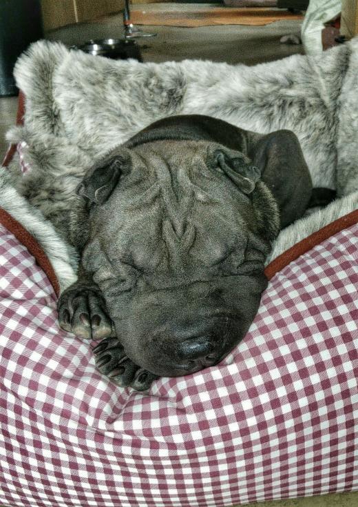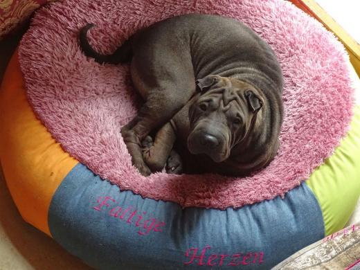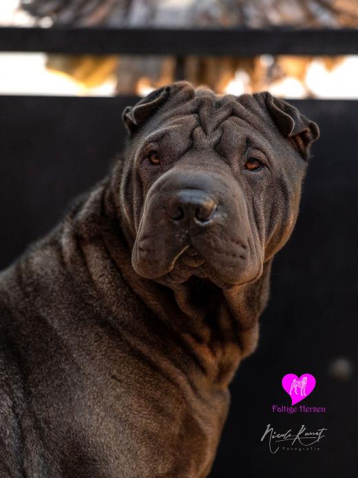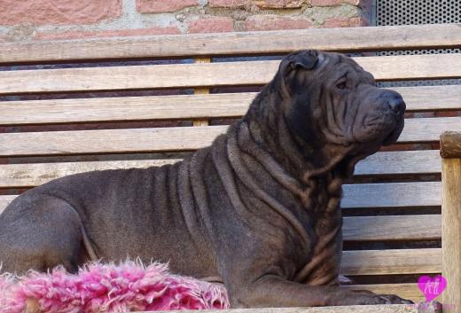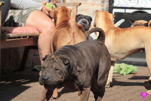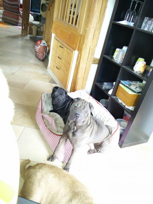 Auf der Suche nach Ergänzung zu unserem Rudel fanden wir über Facebook die Zucht "Shar Peis vom Sonnenberg" von Beatrix und Hannes Pachta. Damals hatte Wally eine schwere Bein-OP hinter sich und konnte nach der OP nicht mehr mit Pink Floyd spielen. Pink Floyd stand immer wieder "traurig" vor Wally und konnte nicht verstehen, warum sie nicht mit ihm spielen konnte. Kann ein Shar Pei Depressionen haben? Damals waren wir fest davon überzeugt. Pink Floyd ging es wirklich nicht gut. Und so suchten wir übers Internet einen Spielgefährten. Auf Facebook blieben wir immer wieder auf den zauberhaften Bildern des Wurfes von Beatrix und Hannes hängen. Besonders das "Nilpferdchen" Coolio-Cooper hatte es uns angetan. Da uns Beatrix vom lebhaften Charakter der Wurfmutter "Little Whirlwind" Charlet erzählte, passte das zu unserem Wunsch für Pink Floyd einen lebhaften Spielgefährten zu bekommen. Sie erzählte uns auch, das sie mehr in die ursprünglich traditionelle Richtung züchten würde, was gleichzeitig mehr Agilität bedeutet. Wir hatten aber keine Ahnung, wie groß der Unterschied wirklich ist. Coolio-Cooper ist der agilste Shar Pei den wir kennen. Er kann ohne Anlauf aus dem Stand auf einen Tisch springen. Wir sind davon überzeugt, dass er Windhund ähnliche Geschwindigkeiten erreichen kann. Aber verbunden mit einer unglaublichen Ausdauer. Ein unglaubliches Kraftpaket und trotzdem liebevoll zu seiner Familie und seinem Rudel. Pink Floyd und Coolio-Cooper waren vom ersten Augenblick an beste Freunde, wie man weiter unten im Video sehen kann. Und Pink Floyd ging es sofort wieder besser mit seinem neuen Spielgefährten.