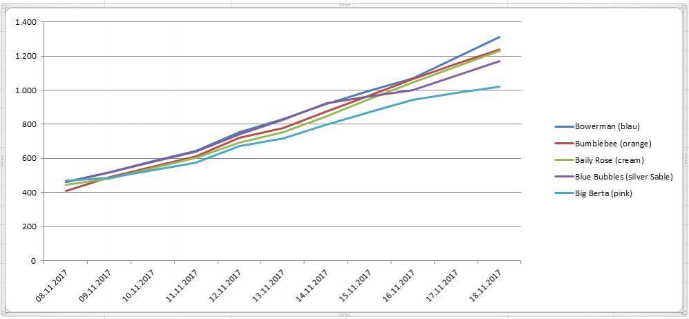 Zur Zeit (18.11.2017) legen die Welpen vom Gewicht her gut zu.