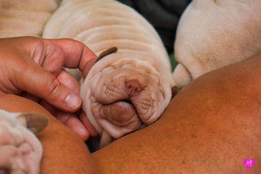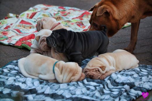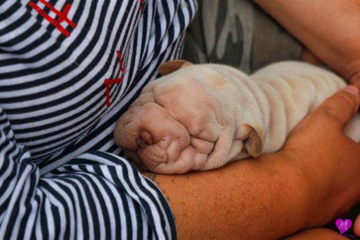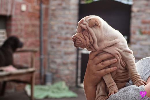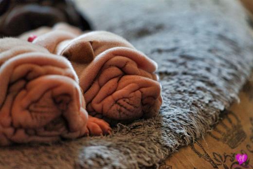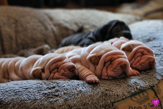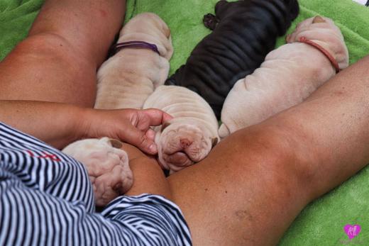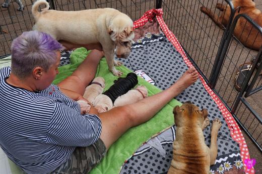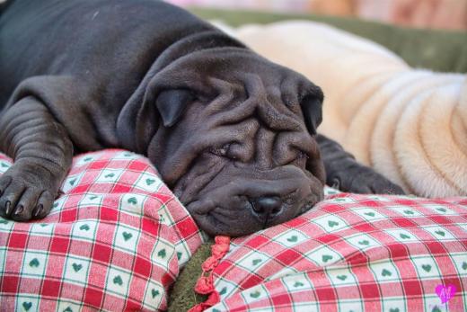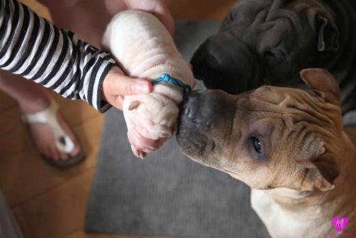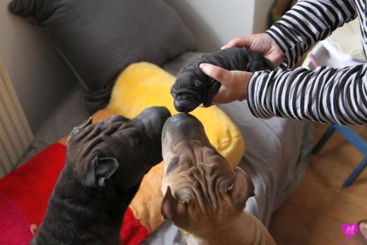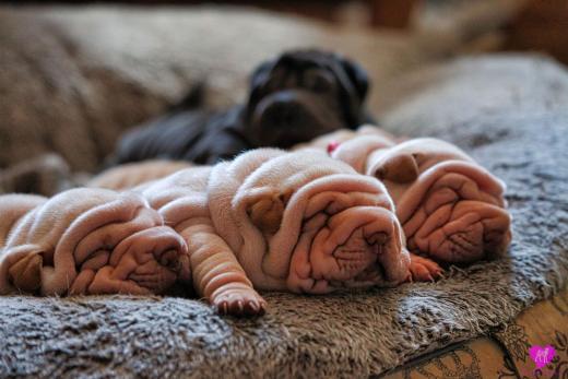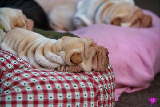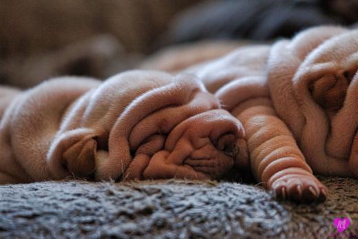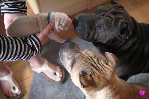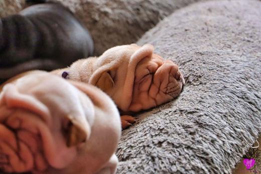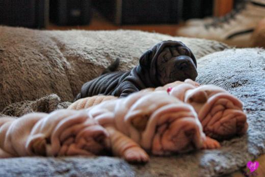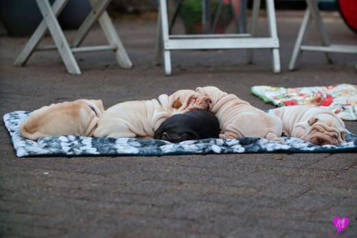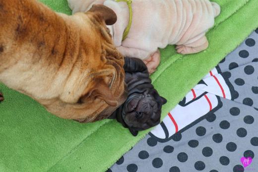 Im Büro war der Boden noch etwas rutschig für die Kleinen. Andrea dachte es ist eine gute Idee, die Kleinen mal in das alte Monki-Schlaf-Bötchen zu legen. Sofort eingeschlafen. Super. Monki weiß noch nicht so richtig. Begeisterung sieht anders aus. Ich glaube seinen fragenden Blick gesehen zu haben: "Wann ziehen die aus?" Die Äuglein der Kleinen gehen auch langsam nach und nach auf. Natürlich nicht wenn sie schlafen. :-) Alle toll entwickelt und sehr ausgeglichen. Das Rudel mag die Kleinen sehr <3 Herz erwärmend zu sehen <3