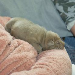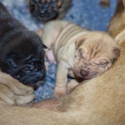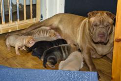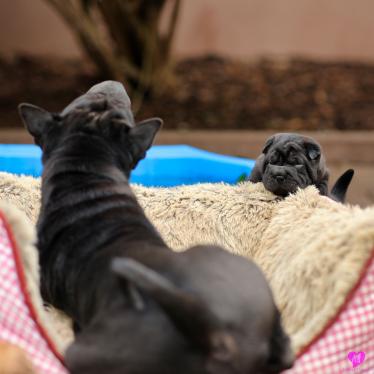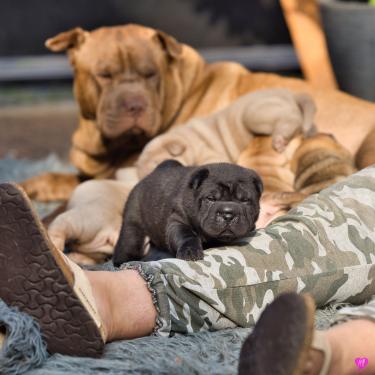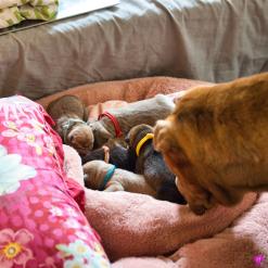 In der Nacht von 4:30 bis 10:00 Uhr ist der E-Wurf mit DREI Mädchen und DREI Jungs angekommen. Alle sind wohlauf. Lucy ist platt, aber ihr geht es den Umständen entsprechend gut.