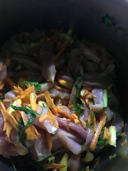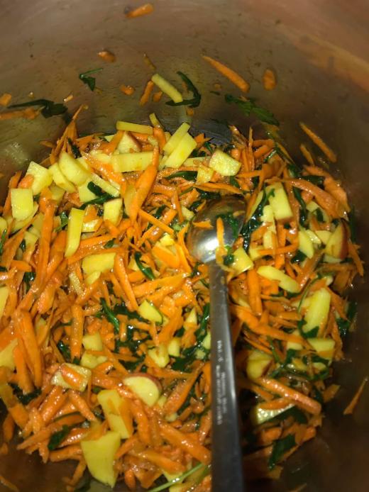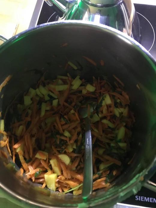 Gemüse, Möhren, Ruccula, Apfel, Kartoffeln, mit Curcuma und Kokosöl vermischen, Fleisch nach Wahl.