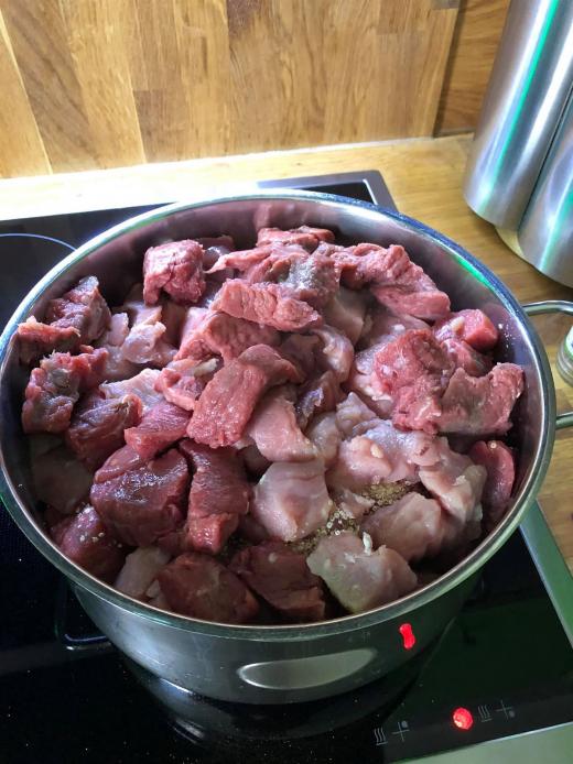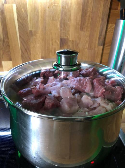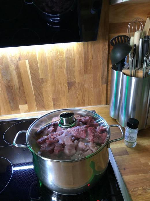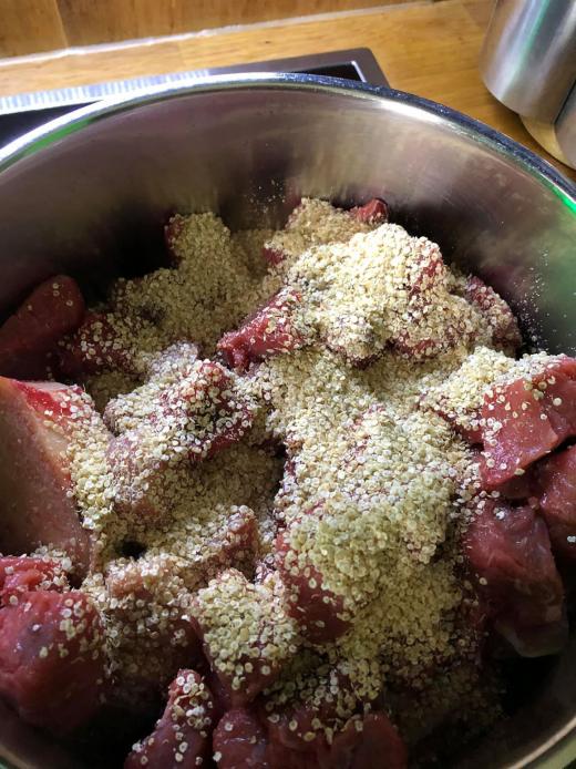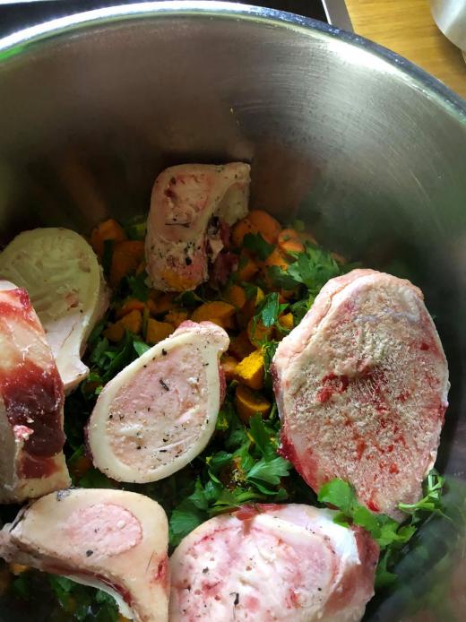 Draußen ist es heute schön aber trotzdem frisch. Genau das richtige Pei -Wetter. Für heute Abend gibt es einen tollen Winter Eintopf der im Herbst auch lecker ist: Kokosöl, Möhren, Sellerie, viele frische Kräuter, Kurkuma, Quinoa, Knochen und Fleisch vom Schwein und Rind plus Gelatine Pulver für Hunde.